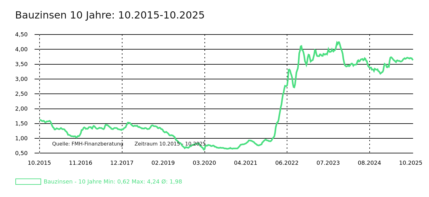 Seitdem ist auf der Welt und am Zinsmarkt einiges passiert. Der durchschnittliche Effektivzins für Baudarlehen mit zehnjähriger Sollzinsbindung ist aber immer noch vergleichsweise günstig: Zwischen 2000 bis 2025 betrug er im Schnitt 3,33 Prozent. Im September 2025 mussten Bauherren und Käufer im Mittel 3,71 Prozent Zinsen zahlen.