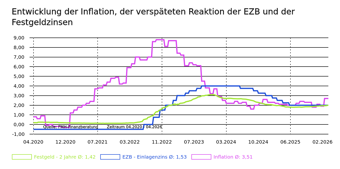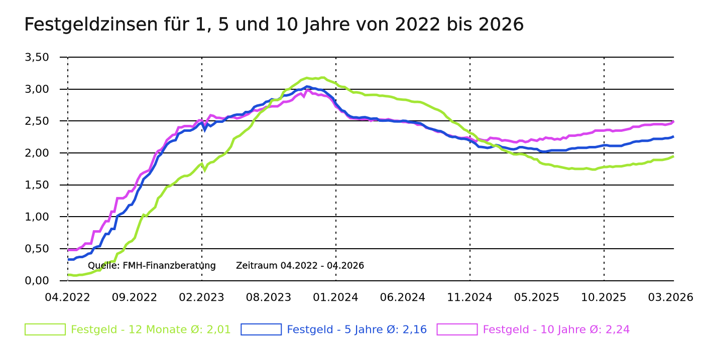 Die Entwicklung der Festgeldzinsen wird sehr stark beeinflusst von der Entwicklung der Inflation und somit auch von den EZB-Leitzins Entscheidungen. Deshalb stellt sich aktuell die Frage: Wie geht es weiter mit dem Iran-Krieg und unseren Erdöl- und Gaslieferungen aus dem Kriegsgebiet? Vermutlich wird die Ölknappheit auch noch einige Zeit weiter bestehen, selbst wenn den Krieg beendet sein sollte. Diese Energieverteuerung wirkt sich voll auf die Inflation aus. Die EZB wird höchstwahrscheinlich sehr kurzfristig auf die steigende Inflation reagieren und ihren Einlagenzins erhöhen, um die Inflation im Griff zu haben. Da in nächster Zeit viele Anleger die steigenden Zinsen nutzen werden, um langfristige Festgelder anzulegen, werden die Banken diese Festgelder nicht besonders gut verzinsen - wegen der hohen Nachfrage. Auf der anderen Seite benötigen die Banken auch kurzfristige Geldanlagen für die Kreditanfragen der Kunden. Um diese kurzfristigen Geldanlagen attraktiv zu machen, gibt es beim Festgeld bis zu drei Jahren oft bessere Zinsen als bei den langen Laufzeiten. Dies wird sich erst wieder ändern, wenn das Zinsniveau längere Zeit stabil bleibt.