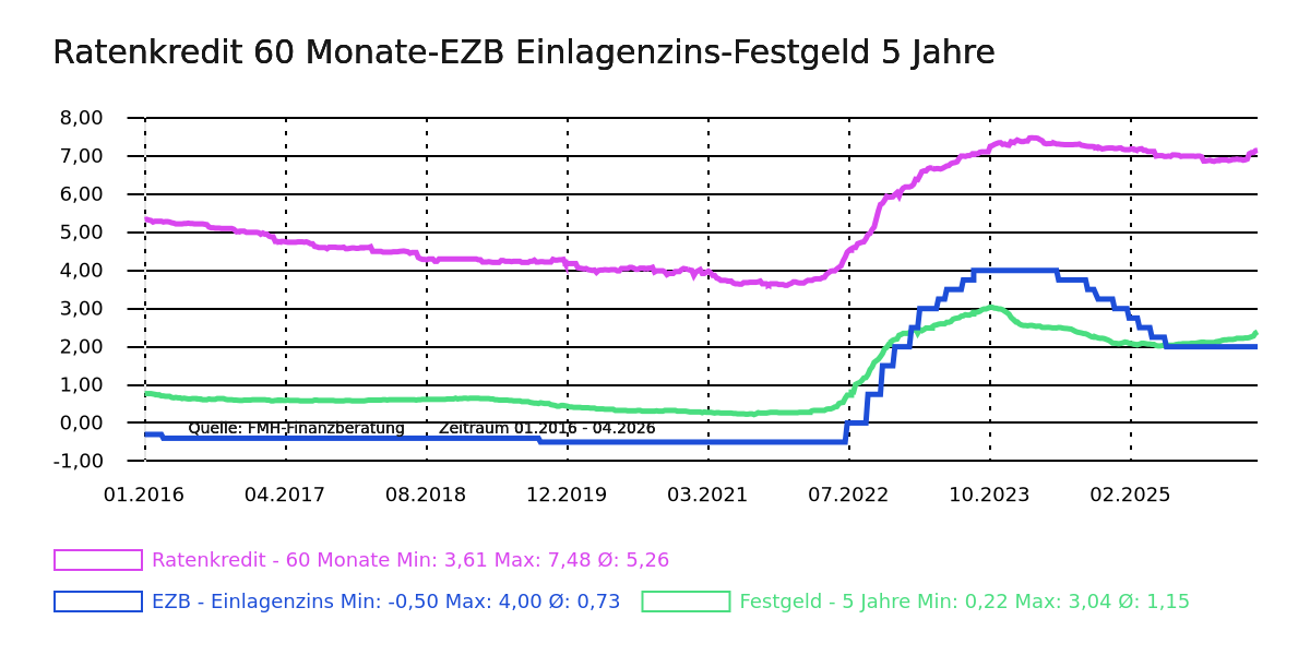 Ich gehe davon aus, dass die Mittelwerte der Ratenkredite in den nächsten Monaten weiter leicht steigen werden. Die EZB wird Ende April die Leitzinsen anheben, die Festgeldzinsen werden dadurch weiter leicht ansteigen und vor allem die Risikoeinschätzung dürfte steigen. Der Irankrieg verursacht steigende Kosten bei der Energieversorgung jedweder Art, was auch die Arbeitslosenzahlen ansteigen lassen wird. Und schon sind wir bei höheren Rücklagen für mögliche Kreditausfälle. Sicherlich wird es auch weiterhin Zinsangebote von fünf Prozent geben, aber nicht für die große Maße der Kunden. Also die Tendenz bei Ratenkreditzinsen laut ganz eindeutig: leicht steigend.